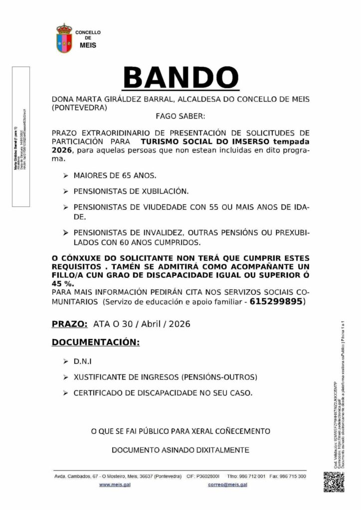 ABERTO o prazo extraordinario de presentación de solicitudes de participación para 𝗧𝗨𝗥𝗜𝗦𝗠𝗢 𝗦𝗢𝗖𝗜𝗔𝗟 𝗗𝗢 𝗜𝗠𝗦𝗘𝗥𝗦𝗢 tempada 2026, para aquelas persoas que non estean incluidas en dito programa.